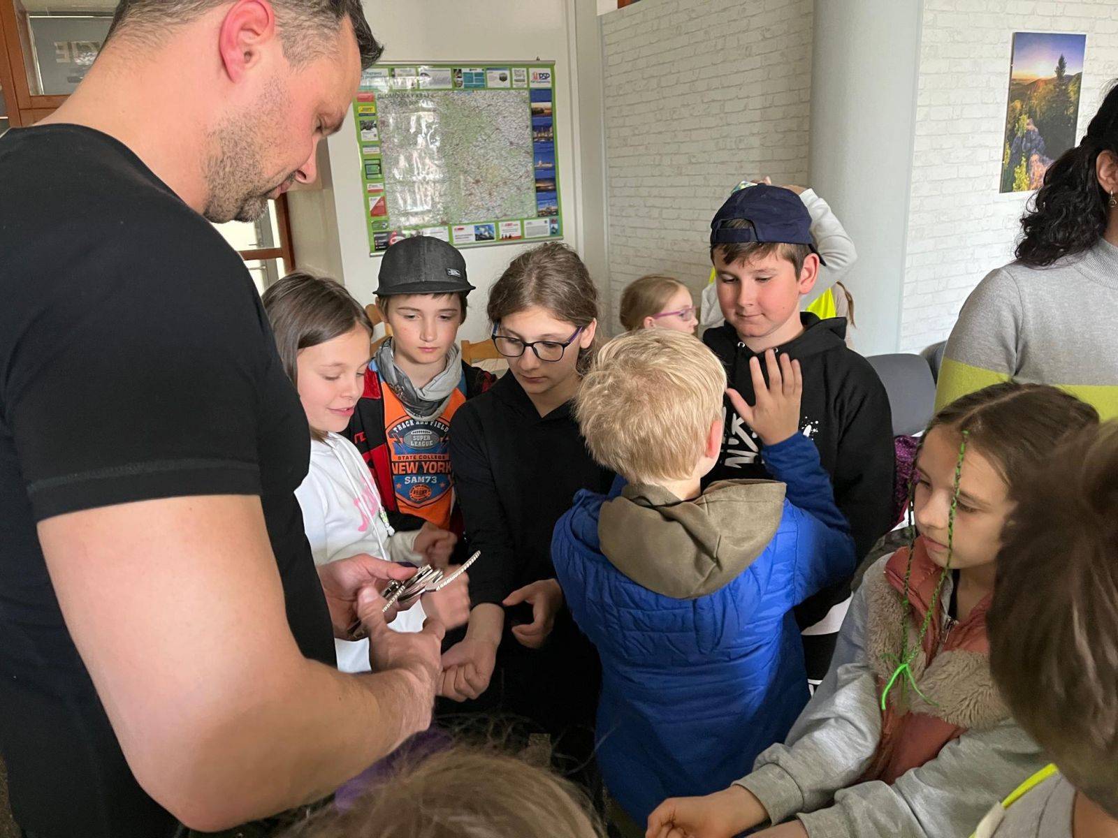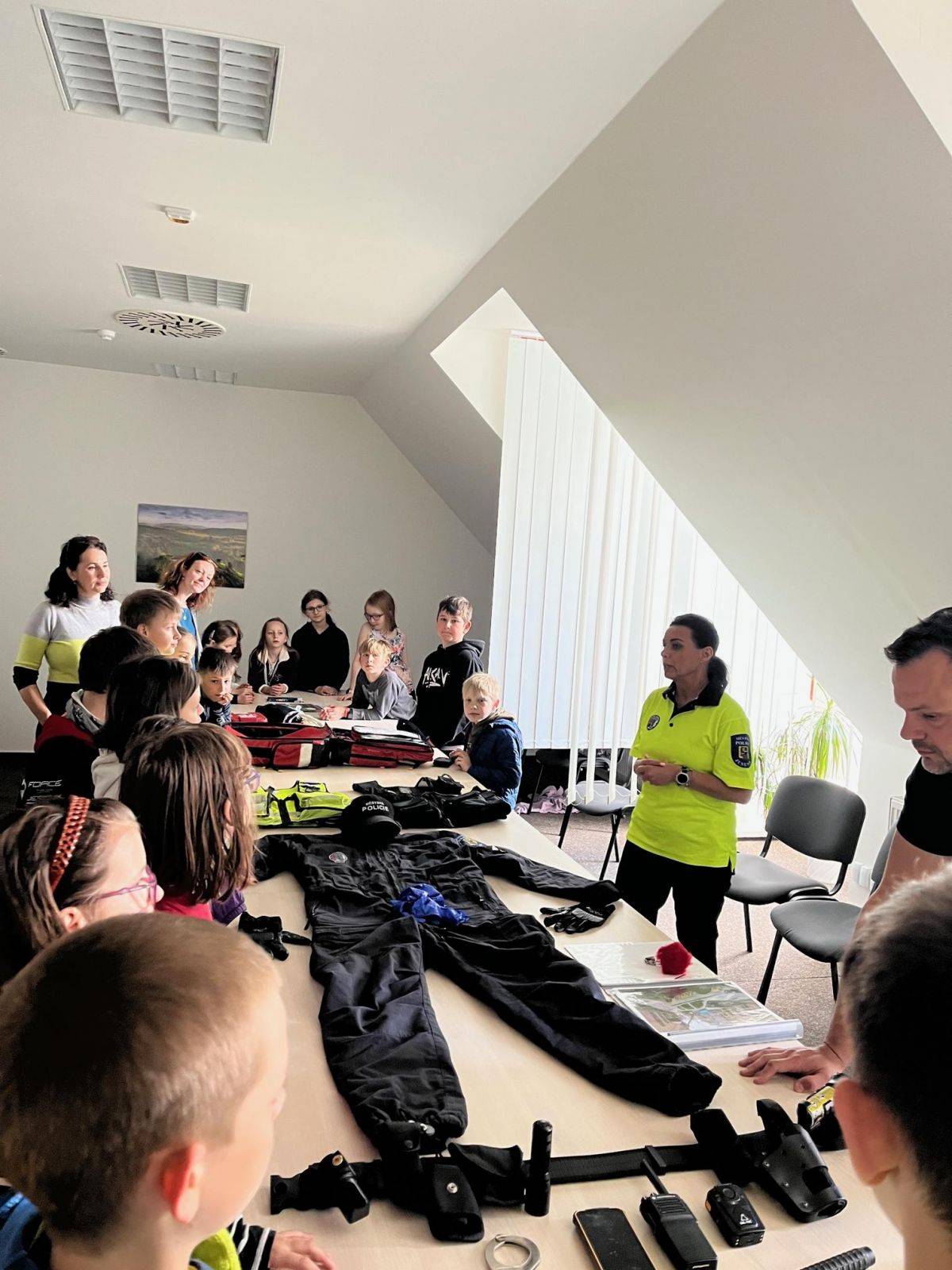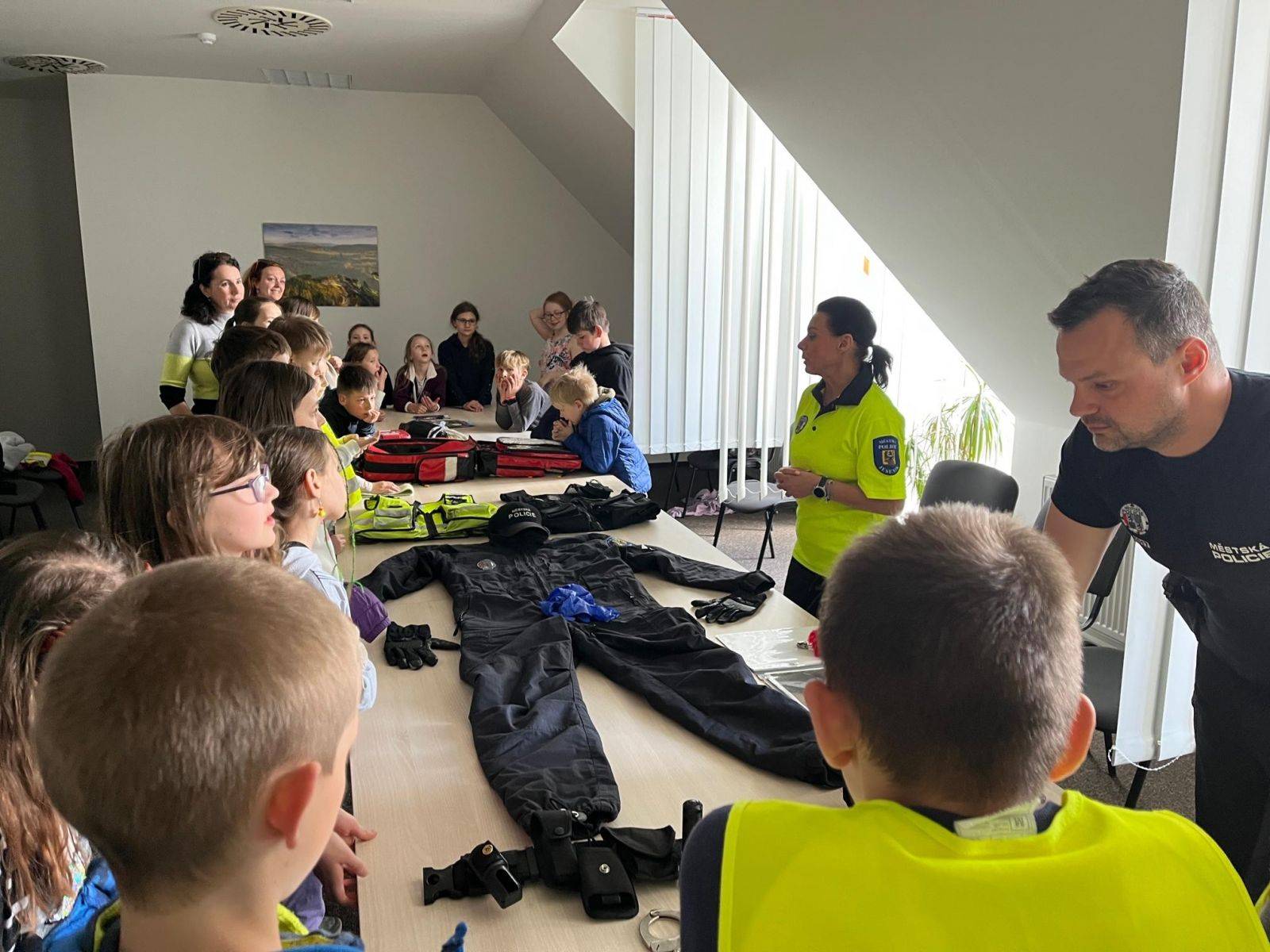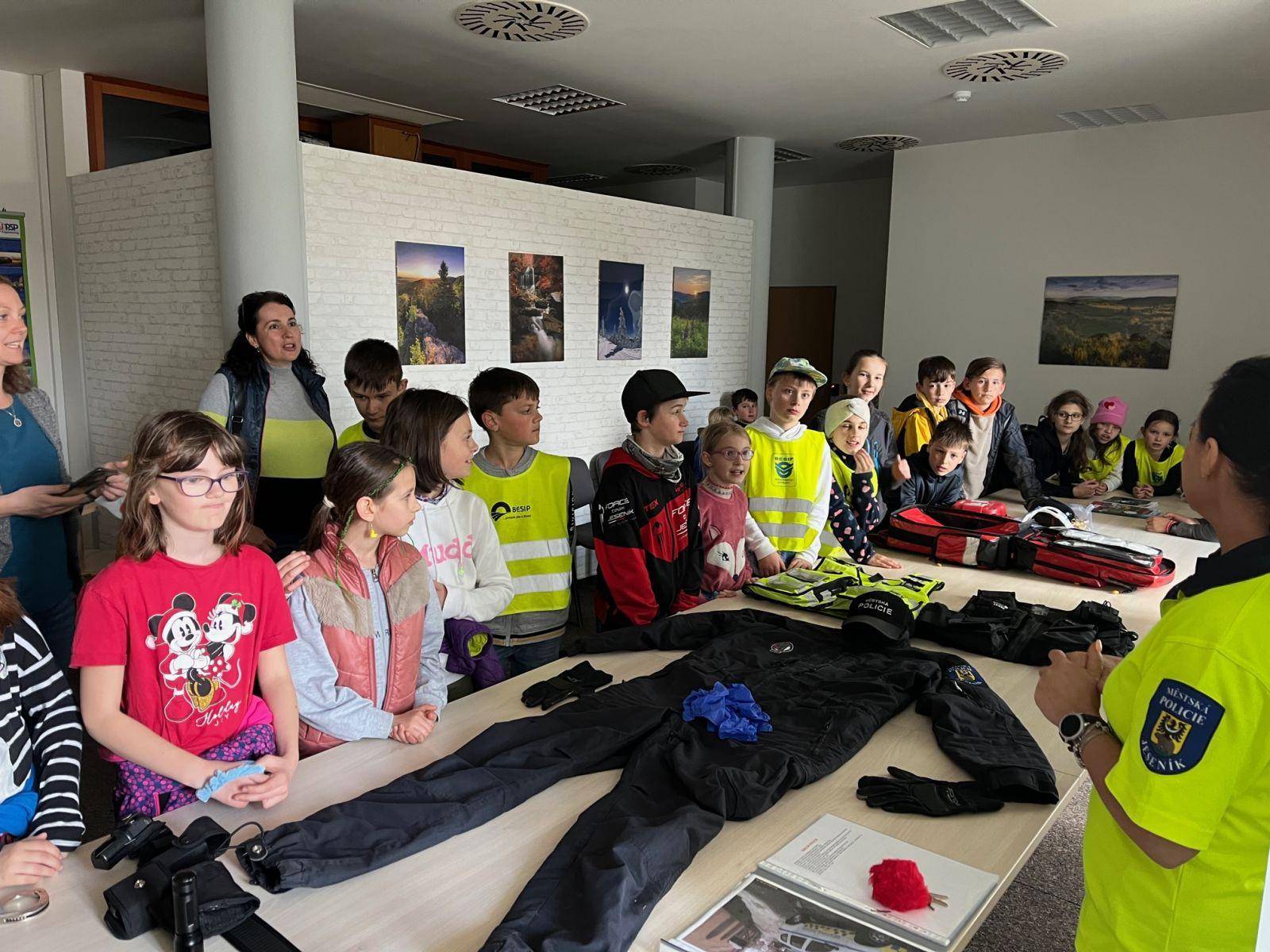 DRUŽINA ZŠ BOŽENY NĚMCOVÉ 10.05.2023 Odpoledne navštívily Městskou policii Jeseník děti z družiny ZŠ Boženy Němcové. Strážníci vedli s dětmi dialog na různá témata, kladli otázky a zodpovídali dotazy. Děti si mohly vyzkoušet služební vysílačku, nasazování pout či prohlédnout laserový měřič rychlosti. Poté se přesunuly na služebnu, kde jim byl představen městský kamerový systém. Venku na ně čekal služební pes a ukázka služebních vozidel a služebního sanitního vozu. | |