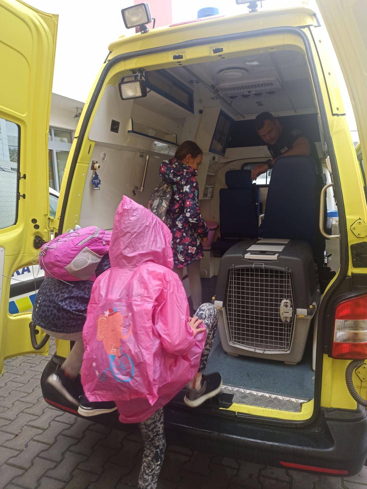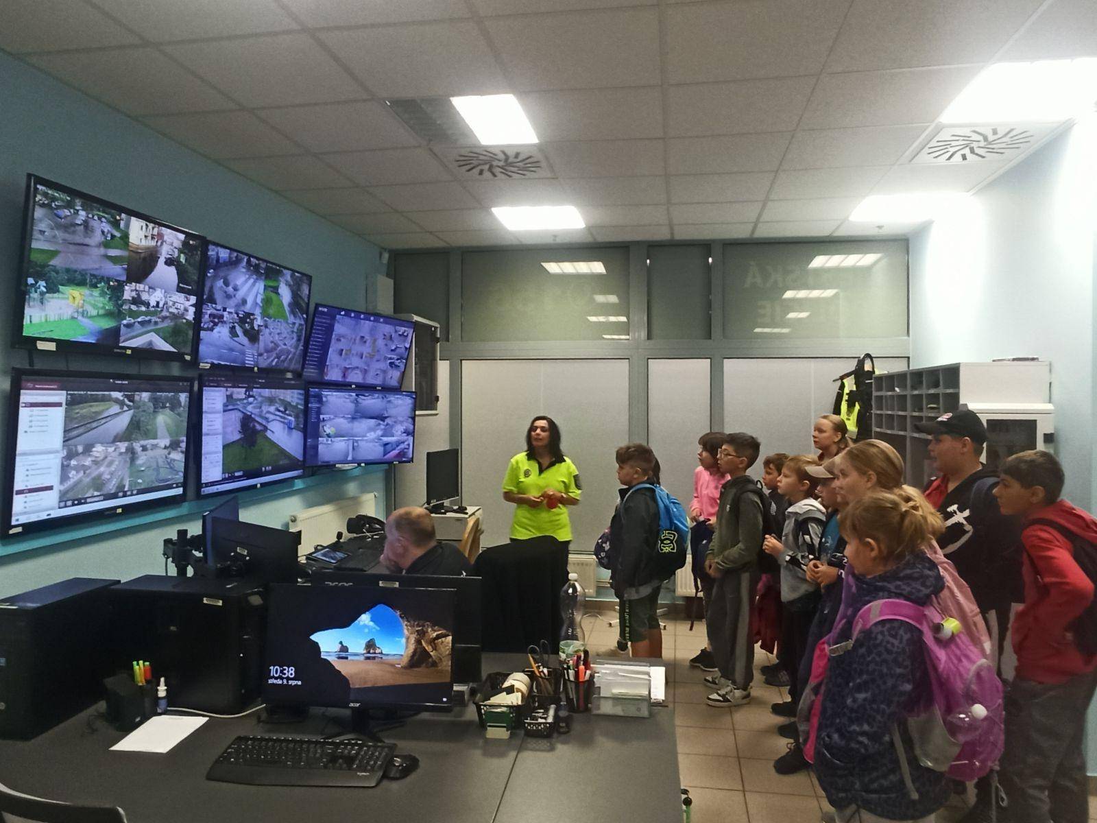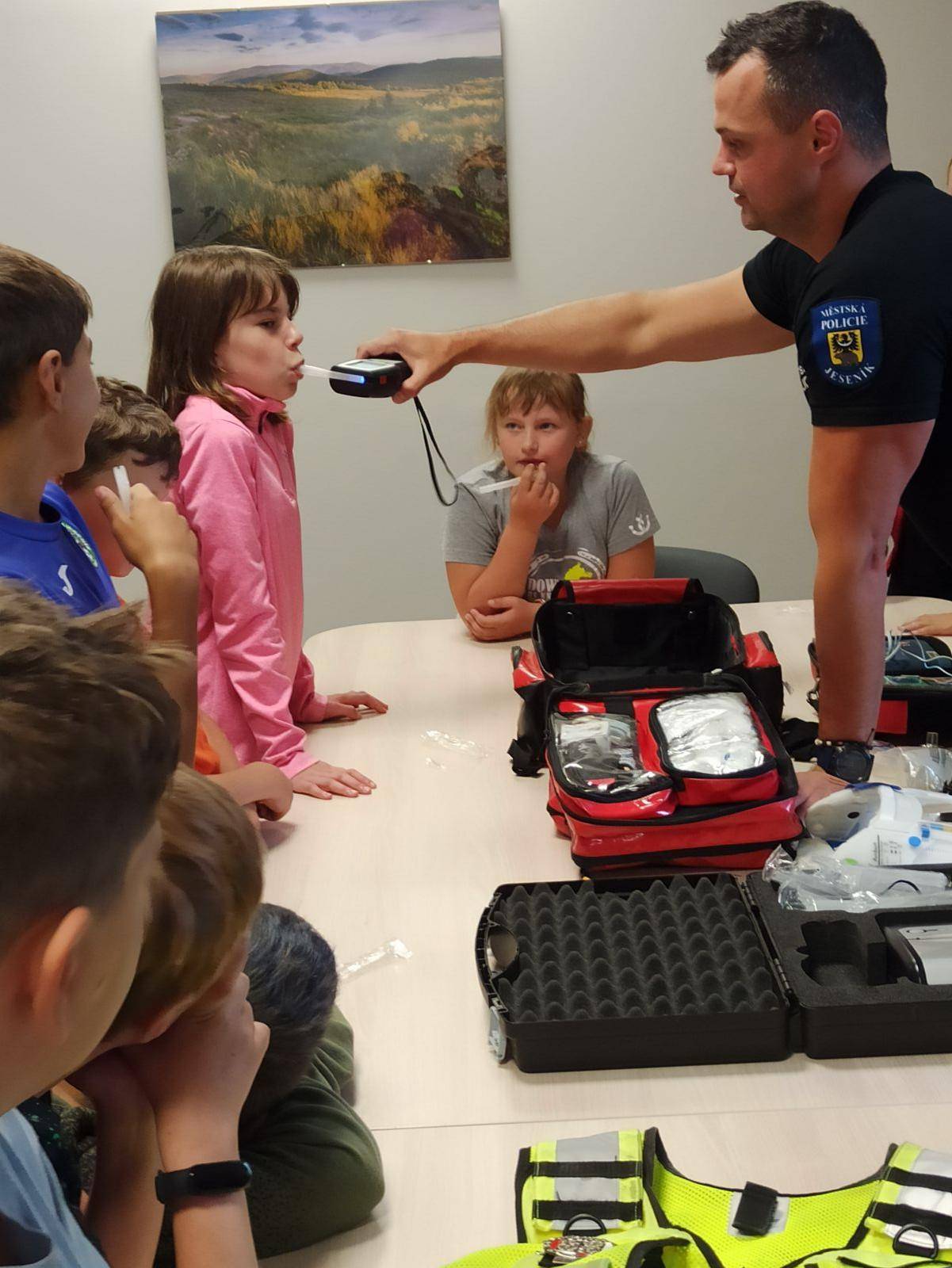 Tábor Na kole vesele II. 09.08.2023 Druhou návštěvu na Městské polici Jeseník dne 09.08.2023 tvořily děti z příměstského tábora TÁBOR NA KOLE VESELE II. V rámci stejného programu si dětí mohly prohlédnut, jak pracuje městská policie. Pro děti byly přichystané ukázky výstroje i výzbroje strážníků. Vzhledem k velmi deštivému počasí přišel služební pes Queen pozdravit děti do vnitřních prostor služebny. I přes nepřízeň počasí vyjádřily děti touhu prohlédnout si vnitřní prostory služebního sanitního vozu a zblízka vidět výstražné zvukového a světelné zařízení (VRZ) služebních vozů městské policie. Cílem programu prevence kriminality byla především snaha strážníků upozornit děti na to, že vše, co městská policie dělá, dělá především proto, aby se ony a jejich blízcí cítili ve městě Jeseník v bezpečí. | |